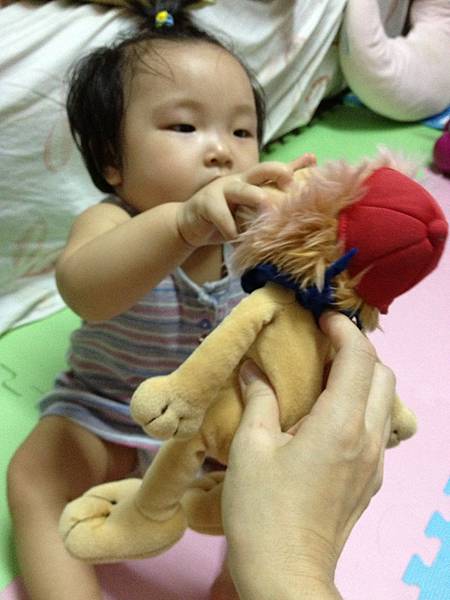 4. 6~7個月以後寶寶可以自己維持坐著幾分鐘,爸爸媽媽可以拿吸引寶寶的玩具,在寶寶寶胸前、左上、右下等不同方向逗弄他,當寶寶往不同方向去觸摸玩具時,可以練習寶寶坐著時的平衡能力。
