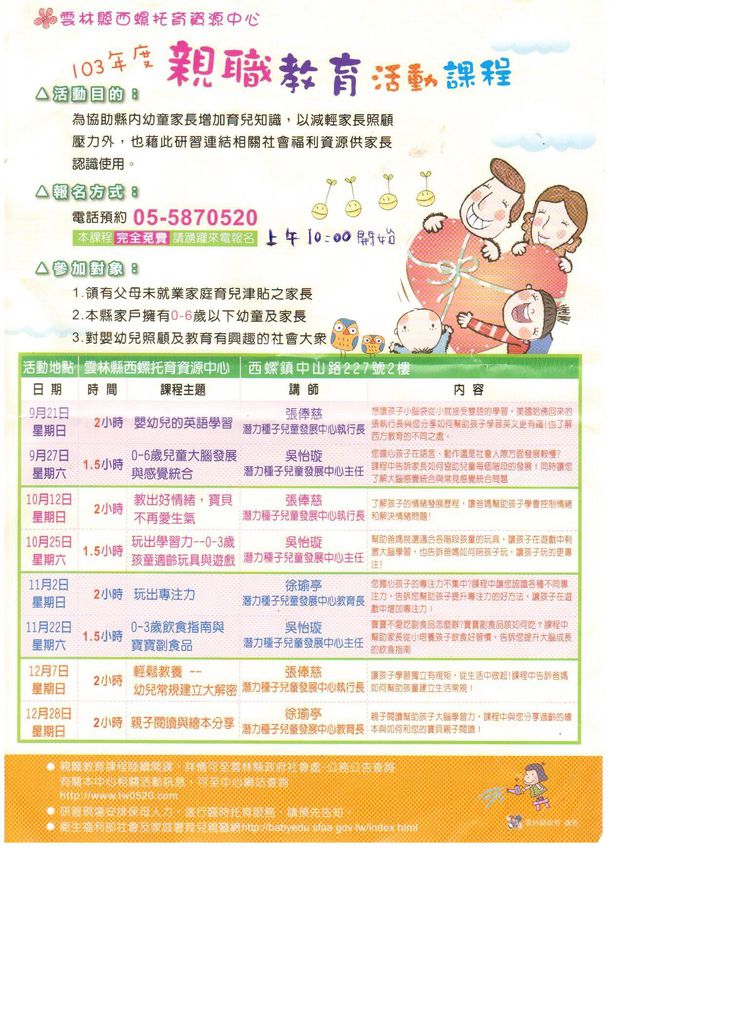 親職講座:雲林縣西螺托育資源中心103年度親職教育活動課程