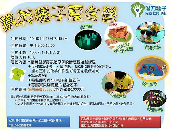 1.因攸關配料若活動若不克前來,請於7/20日前(含)來電取消,逾期無法退費唷!