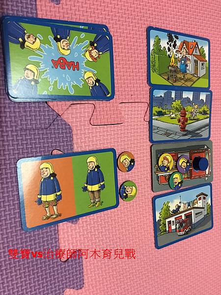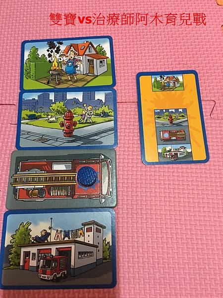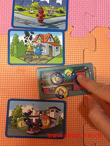 3.隊長大喊「失火了!」同時翻開一張「慢郎中」牌卡,翻中的牌中兩個慢郎中無法出勤,其他3位消防隊員要立即上消防車。