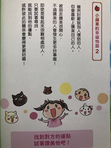 故事中的小蘋果與8種可愛動物,畫風非常逗趣。而每一個角色都有不同的個性,可能代表著生活中各種孩子的性情。故事內容更像是孩子在家中或進入校園會遭遇的情境,如跟朋友吵架時、自以為是被孤立時、常常臭臉沒有人理時、被大人責備時、忌妒媽媽愛弟弟。故事簡單卻富有深意,貼近孩子生活感受的情節剖析,更讓孩子覺得被了解。